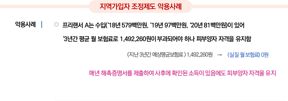 ○ 그런데, 소득이 있는데도 불구하고 이를 이용하여 보험료를 부당하게 줄이려는 사례가 지속적으로 발생하여, 직장가입자와의 형평성 문제가 대두되고 있다.