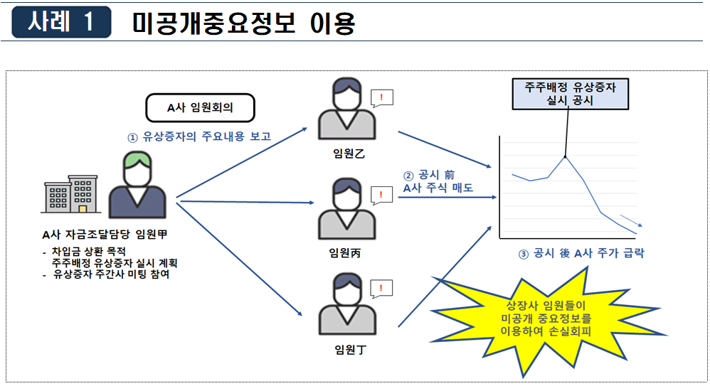 ➀ 코스닥 상장사 A의 임원 甲(자금조달 및 공시업무 담당 상무)은 차입금 상환 등 목적의 ‘주주배정 유상증자(악재성 미공개정보)’를 결정하고,