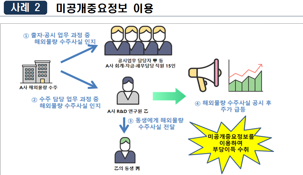 | ◈ 회사의 직원은 미공개중요정보에 접근할 수 있는 내부자에 해당하고, 직무와 관련하여 회사의 미공개중요정보를 지득하여 이를 이용한 경우 미공개중요정보 이용행위에 해당합니다. - 내부자로부터 미공개정보를 전달 받아 이용한 자도 동일하게 처벌됩니다. |