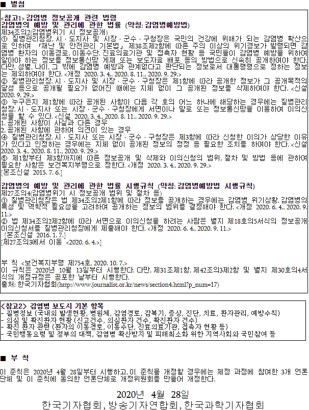 ○ 다음은 2020년 4월 28일, 한국기자협회·방송기자연합회·한국과학기자협회에서 제정한 「감염병 보도준칙」의 주요 내용으로, 감염병 관련 보도 시에 참고해 주시길 바랍니다.