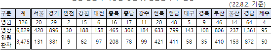 전국 326개 병원에서 6,829명의 코로나19 환자가 일반입원이 가능한 것으로 파악, 현재 3,475명이 일반입원 중(8.2. 기준)